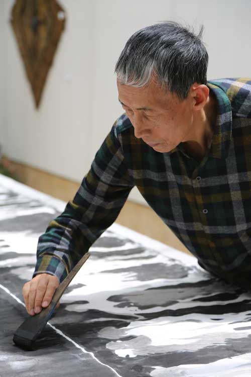 果然,韩书力在后来的绘画创作中大行减法,甚至一反常态玩起了笔墨游戏,他笔下的水墨泛滥是从水墨加拓印的小品画开始的,1995年他连续创作了诸如《见真性不乱为禅》、《小荷初露》、《无真不俗》、《不渡天縁人》、《有教无类》、《思无邪》、《非礼勿视》、《井底之蛙》、《天鹅肉老》、《雕虫》、《方便》、《无法无天》、《什么东西》……等一大批妙趣横生的作品,这样的艺术奇葩,恐怕只有在“老君炉”里才能恰到好处地掌控火候。这类作品的品格是睿智的、文化的、并洋溢着随手拈来的轻松愉快,点石成金的超人手段,而且随心所欲地为诸君奉上绝无仅有的高档幽默,但绝非“漫画”,而是以稀缺的文化资源“玛尼石”入画再生,融入雅趣、巧思的,西藏当代文人画。再后来就诞生了“韩氏黑画”,所谓“黑画”是以黑色作底,玩构成、玩笔墨、玩意境,在美学建构上是“计白当黑”的反用,“黑”在东方观念中并非只是一种色相,顺着老子的哲学导向远望,韩书力触及了“玄之又玄众妙之门”之奇妙境界,他步入更广阔的文化空间,享受着“乘物以游心”的极乐!其间,新作“汗马图”立下了汗马功劳,这幅长卷堪称“韩氏黑画”的典范之作。我在为此画题跋时曾就“黑画”之新意作过述评:“‘黑画’以浓厚底色烘托出种种化外物象,览之如步月夜旷野,如临太虚幻境,令人耳目一新、余兴绵长,非佳构难能有如此妙好之感应。画家韩书力何以得此精彩微妙法门?其缘起概出于雪域冥想,皆发乎佛心参悟。他作画有三步曲谐奏:读古今有趣之书;想当下天下之事;图心中唯美之画。久而久之如有神助、得心应手。或曰黑画不黑,可视为玄妙无垠的辽阔宇宙,可看作心领神会的深远太空,作者以心为镜,映现天地间许多可爱之物,把玩古典或当代的诗情画意……那些明净的物象,即是形而上的精灵,虽然虚无飘藐,却也绘声绘色,引来天籁之音,呈现大朴之境,融汇为心花意象,能不赏心悦目!”。“韩氏黑画”有《香草、美人、顶戴》、《道不同不为相谋》、《小盗盗御马》这样唯美又略施调侃之作,也有《鹤鸣九皋》、《惜羽》、《高瞻图》等遣兴之作,更有《江山 . 美人》、《破壁图》、《高高的喜玛拉雅》等与《汗马图》相呼应的宏图巨制。就整体审视,韩书力的水墨作品与其布面重彩作品有异曲同工之妙,其炼意、谋篇、意匠独创的内在着力点是一脉相承的,当我们通过作品赏读,随他的心路踪迹步入其独标异彩的艺术空间时,便不难在心灵层面去接近他,进而感受和认同他的终极关怀、他的创作旨向。那就是古远的部族文明、宗教文明与现代文明所撞击出的火花,是熔儒、道、释乃至现当代观念于一炉的天花雨落,在适当距离之外,仍可见与相对无言的现实生活相克相随的人文景观。他以美的尺度拣选形象、题材,又以美丽心灵将其融溶定格,看似轻描淡写的取舍重构、信笔图抹,每每有煞费苦心的反復推敲、或山重水復疑无路的艰难跋涉,“善舍”又谈何容易!