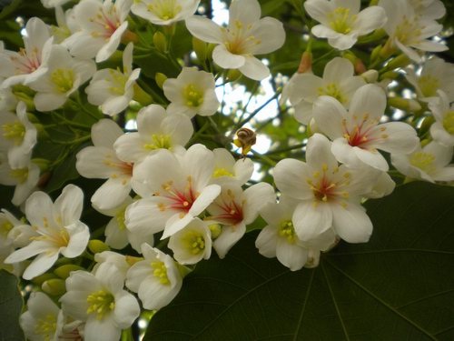 千年桐(Aleurites Montana E.H.Wilson),由于果皮皱纹,经济寿命长,故得名千年桐或皱桐,又名金臣树、木油桐、广东油桐,为大戟科(Euphorbiaceae)油桐属落叶性乔木,高达20m。树皮平滑,灰色,叶互生,全缘或2-5裂。花瓣5片,花瓣白色或基部带紫红色且有紫色脉纹;雌雄异株,或有时同株异序,花期3—5月,开花能招蜂引蝶。果实为核果,卵形至扁球形,但种子含有毒蛋白及皂素成分,误食会引起呕吐、腹泻及休克等症状。